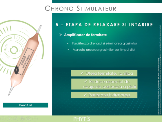 Etapa 5: Bineinteles ca vom incheie cu ETAPA DE RELAXARE SI TONIFIERE, cu ajutorul fiolei Chrono Stimulateur, un amplificator de fermitate ce faciliteaza drenajul si eliminarea grasimilor, in timp ce pastreaza hidratarea pe parcursul intregii zile.