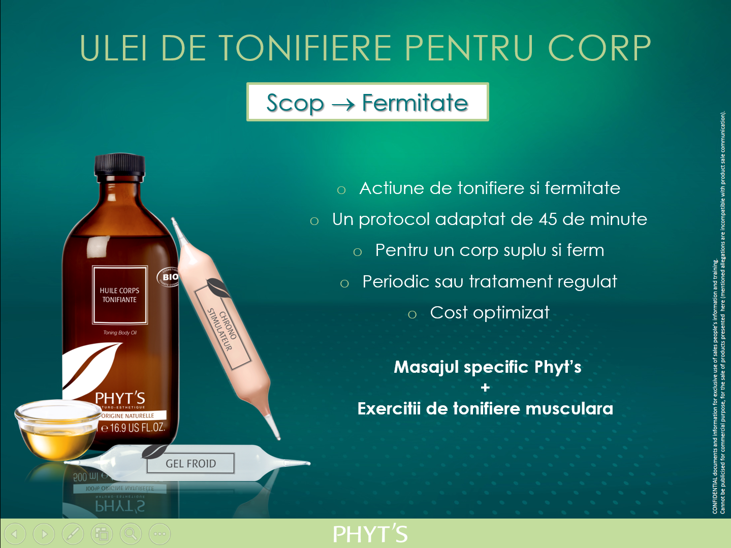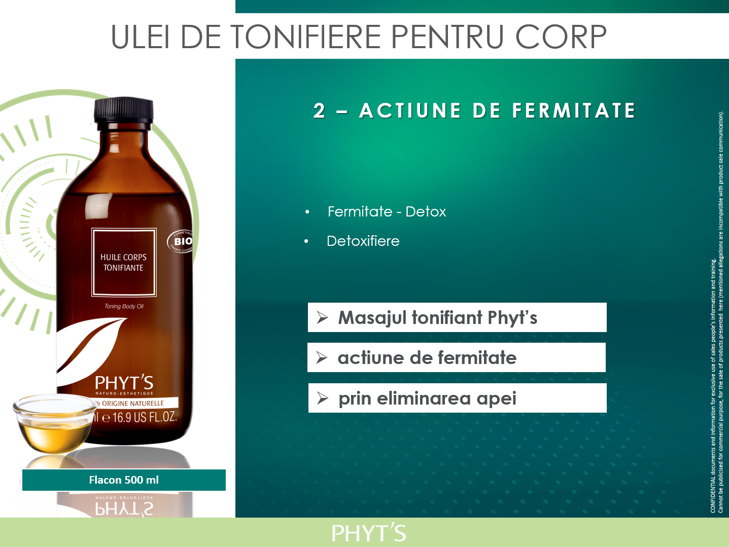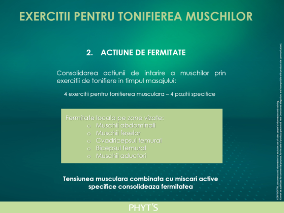 Etapa 2: Actiune de fermitate cu Ulei de Tonifiere Phyt’s,  ce detoxifica profund, elimina apara si stimuleaza tonifierea pielii. Tensiunea musculara combinata cu miscari active specifice realizate de naturo-esteticianul Phyt’s consolideaza fermitatea.