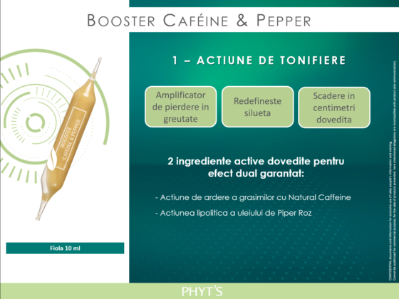 Etapa 1: Booster Caféine & Pepper cu actiune de tonifiere, un amplificator de pierdere in greutate, ce garanteaza o scadere in centimetri rapida. Contine 2 ingrediente active principale cu efect dual: Natural Coffeine – are actiune de ardere a grasimilor si ulei de Piper Roz – actiune lipolitica.