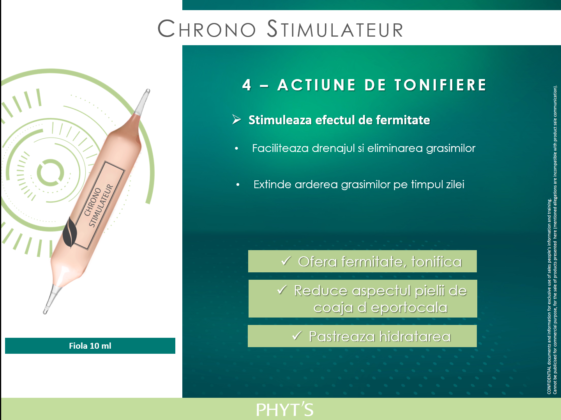 Etapa 4: Tonifiere profunda cu ajutorul fiolei Chrono Stimulateur, un amplificator de fermitate ce faciliteaza drenajul si eliminarea grasimilor, in timp ce pastreaza hidratarea pe parcursul intregii zile.