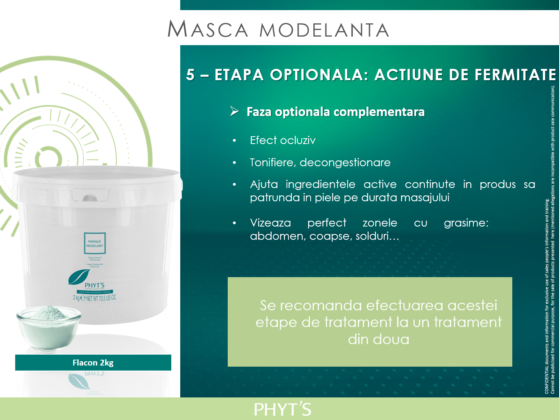 Etapa 5: Este o etapa optionala ce consta in aplicarea unei masti modelante cu efect de fermitate. Se recomanda efectuarea acestei etape de tratament la un tratament din doua. Are efect ocluziv, de tonifiere si decongestionare, in timp ce ajuta ingredientele active continute in produs sa patrunda in piele pe durata masajului. Vizeaza perfect zonele cu grasime: abdomen, coapse, solduri…