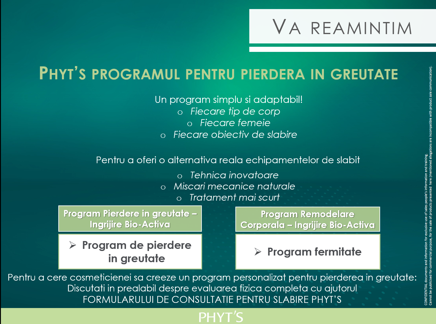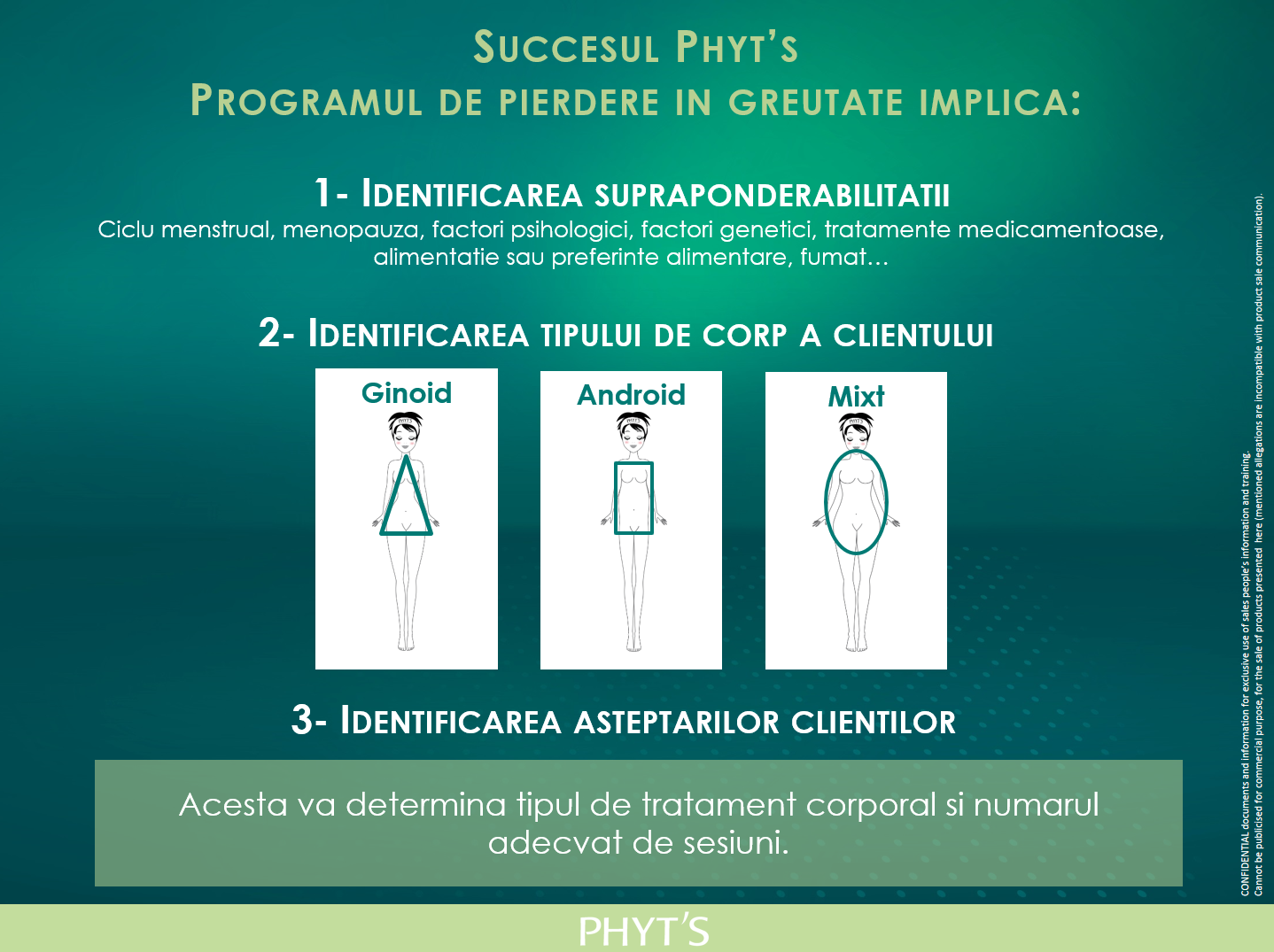 Cresterea in greutate a multora dintre noi poate avea diverse cauze, iar naturo-esteticienii Phyt’s sunt pregatiti sa le descopere alaturi de tine. Poate fi vorba despre o problema hormonala, tiroidiana, genetica, sau chiar rezultatul stresului de care ne lovim zilnic. Vorbim despre mai multe forme de corp si mai multe tipuri de celulita ce pot fi tratate in mod natural, cu produse 100% organice. Laboratoarele Phyt’s au conceput un intreg program de slabire si fermitate.