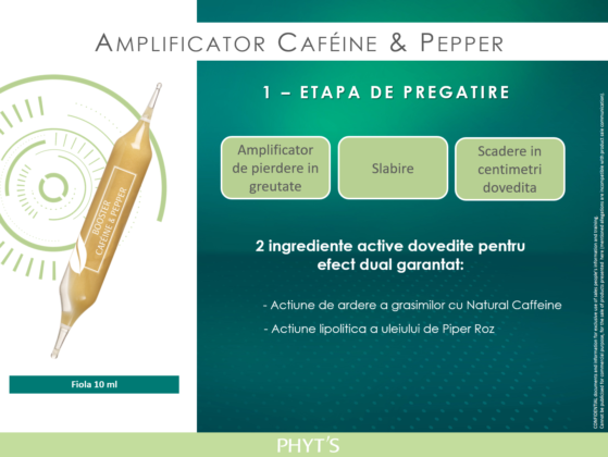 Etapa 1: ETAPA DE PREGATIRE, unde vom folosi Amplificator Caféine & Pepper, un amplificator de pierdere in greutate, ce garanteaza o scadere in centimetri rapida. Contine 2 ingrediente active principale cu efect dual: Natural Coffeine – are actiune de ardere a grasimilor si ulei de Piper Roz – actiune lipolitica.