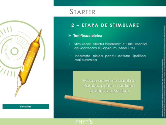 Etapa 2: ETAPA DE STIMULARE, etapa in care naturo-esteticianul va folosit fiola Starter. Stimuleaza efectul hiperemic cu Ulei esential de Scortisoara si Capsicum (Ardei iute) si incalzeste pielea pentru actiune lipolitica mai puternica. Miscari active cu batul de Bambus pentru o actiune profunda de slabire. Care sunt efectele betelor de bambus?