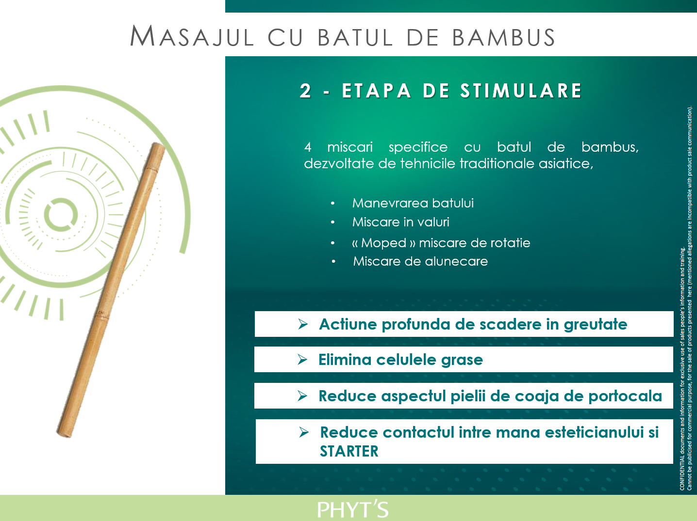 Obiectiv – Slabire | Actiune lipolitica si arderea grasimilor | Protocol adaptat | Tinteste zonele cu aspect de coaja de portocala Tehnici de masaj Phyt’s cu bete de Bambus