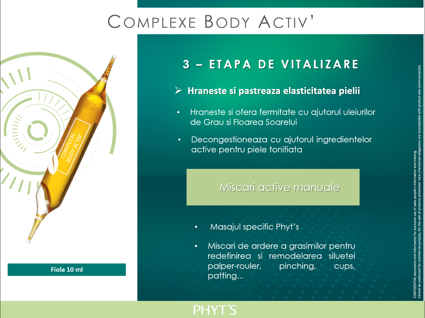 Etapa 3: ETAPA DE VITALIZARE.  Fiola Complexe Body Activ’ hraneste si pastreaza elasticitatea pielii. Hraneste si ofera fermitate cu ajutorul uleiurilor de Grau si Floarea Soarelui si decongestioneaza cu ajutorul ingredientelor active pentru piele tonifiata. Naturo-esteticianul va realiza miscari de ardere a grasimilor pentru redefinirea si remodelarea siluetei.